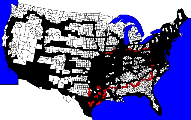 - Texas: Bee, Brazoria, Brazos, Burleson, Burnet, Coryell, DeWitt, Erath, Galveston, Goliad, Grimes, Hamilton, Hardin, Houston, Jasper, Karnes, Lampasas, Lavaca, Matagorda, Newton, Rains, Sabine, San Augustine, Shelby, Smith, Somervell, Trinity, Tyler, Van Zandt, Wilson, Wood (170/254, 67%)